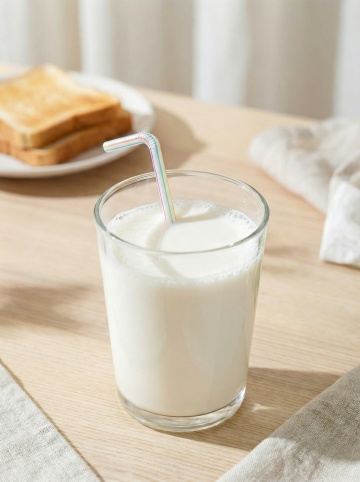 一张温馨明亮的早餐场景特写照片,画面中心是一只优雅的白色陶瓷咖啡杯,置于配套的白色碟子上,纯净的牛奶正从一个透明玻璃奶壶中缓缓注入杯中,形成优美的白色奶柱,杯口泛起细腻的奶泡,质感清晰可见。背景中隐约可见新鲜的黄色面包、红色草莓和白色花朵,营造出自然、舒适的早餐氛围,光线柔和,色彩温暖和谐,整体构图聚焦于倒牛奶的动态瞬间,细节丰富,充满生活气息。