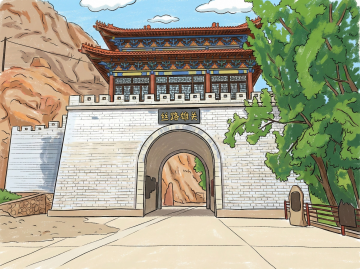 中式古典插画风,国潮元素融入虚拟自然景观,展现山水和谐之美。