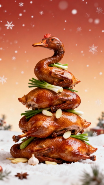 圣诞树造型白切鸡,鎏金文字与金属质感装饰,喜庆节日氛围浓厚。