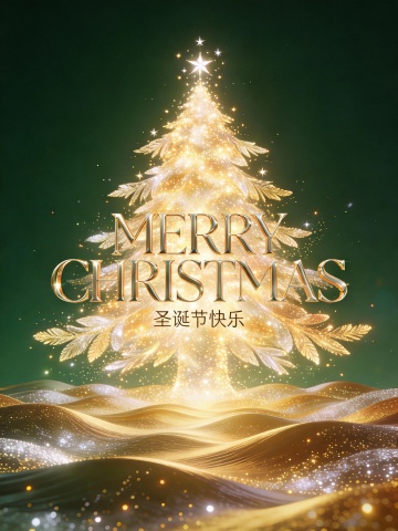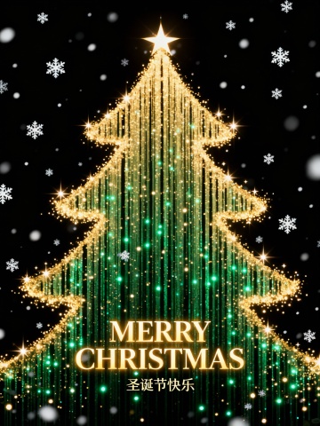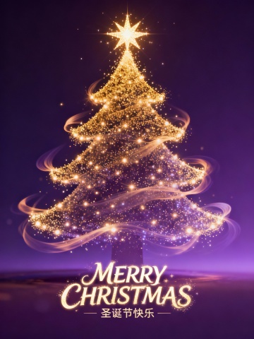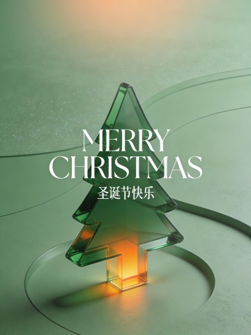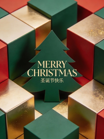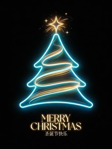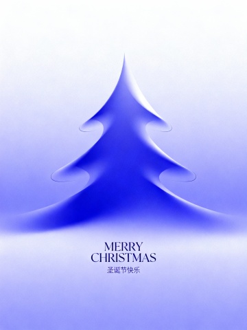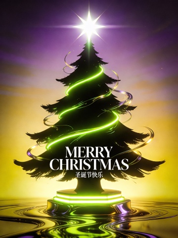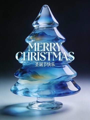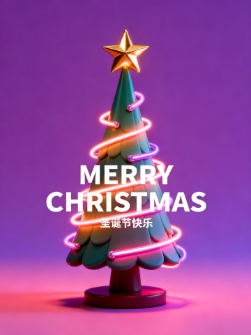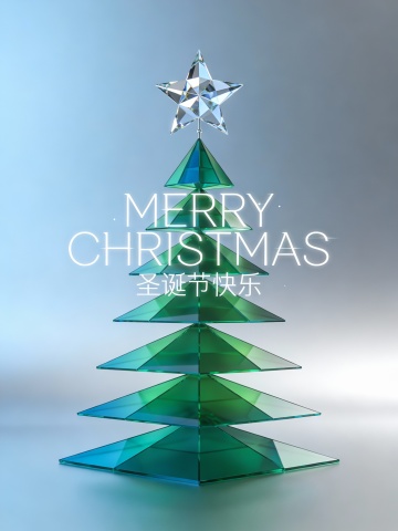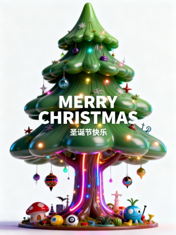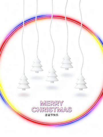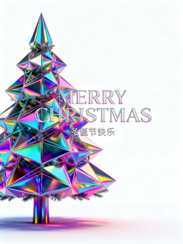 画面中央搭配醒目的艺术字体“MERRY CHRISTMAS”,下方以精致小字呈现“圣诞节快乐”。整体视觉风格现代而富有创意,色彩延续粉色、绿色、橙色与蓝色系的搭配,在鲜艳活力中保持和谐平衡。蓝色透明轮廓有效增强圣诞树的立体层次,使构图生动且富有韵律。