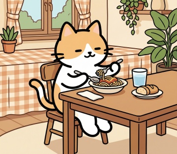 软3D风拟人猫互动,温馨居家场景,趣味文字“授猫以鱼如授人以渔”,萌趣治愈,传递温暖与智慧。