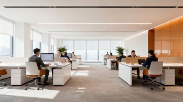 明亮现代的开放式办公室,专业商务人士正在办公桌前专注工作,配备电脑、办公文具和文件,玻璃隔断墙划分空间,白色天花板嵌入方形LED平板灯提供充足照明,灰色地毯地面,角落摆放大型绿植增添生机,整体色调以白色、灰色和蓝色为主,呈现简洁高效、专业有序的职场氛围,不同环境和角度下的办公室背景,光线明亮柔和,空间通透,办公家具现代简约,员工穿着统一深色工装,展现团队协作的工作场景。