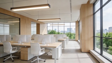 极简主义风格的现代办公室内部,开放式办公布局,浅木色办公桌整齐排列,配备灰色办公椅与黑色电脑显示器,大面积落地窗引入明亮自然光,天花板装有长条形LED白色照明灯管,地面铺设浅灰色地毯,角落摆放绿色大型绿植,整体色调以白色、浅木色、灰色为主,呈现简洁、专业、通透的氛围,不同环境角度下的办公室背景,保持相同的极简现代风格与色彩搭配。