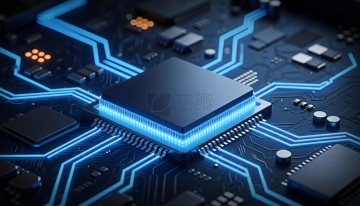 3D渲染风格的科技感背景,以深蓝色与黑色为主色调,中央是一块散发着明亮蓝色光芒的方形芯片,芯片边缘有蓝色灯带环绕,周围布满精密的黑色电路板和各种电子元件,电路板上点缀着蓝色和橙色的发光小点,整体呈现出强烈的金属质感和科技氛围,光影效果突出,高光与阴影对比鲜明,营造出深邃而神秘的未来科技感,画面构图聚焦于中央芯片,四周元件有序排列,具有良好的视觉引导和层次感。