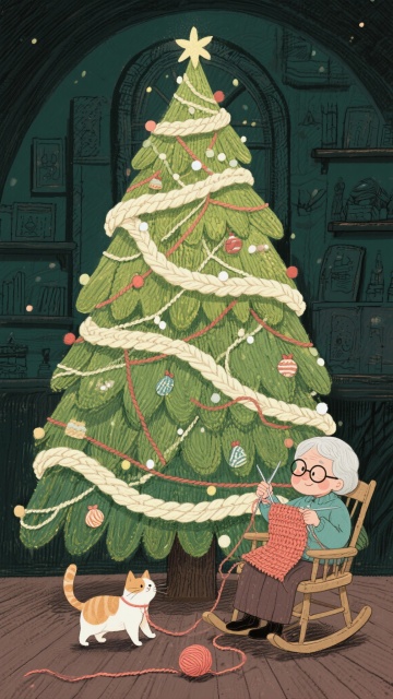 三只拟人猫咪合力装饰圣诞树,充满喜庆与卡通趣味,节日氛围浓厚。