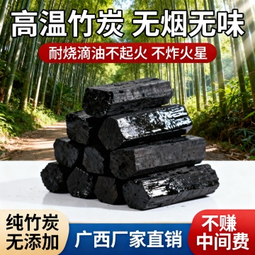清新竹林实景背景,质朴竹炭堆叠,大字风促销文案,双色设计强化信息层级,印刷风视觉呈现,突出无烟无味、厂家直销卖点。