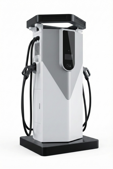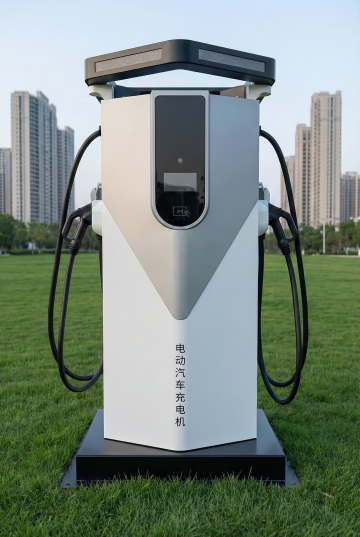 现代科技感与户外实用美学结合的直流智能充电桩,线条简洁利落,银灰色和白色金属质感,黑色底座,中部偏左动态构图,背景融入远山篝火光影。
