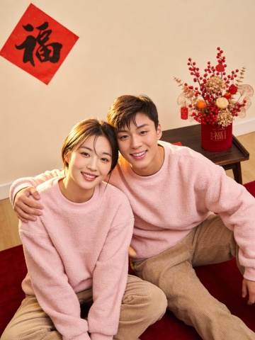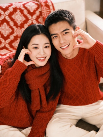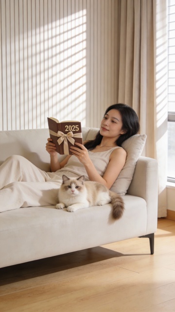 温馨简约风居家环境(暖白色墙面 + 原木色置物架 ,置物架摆小巧陶瓷 / 木质摆件;浅白色柔软地毯 + 浅色系宜家布艺沙发 + 暖棕色抱枕),柔和自然光洒入、光影柔和;画面中左边年轻女性,深棕长直发披肩,,上身穿米黄色高领绞花宽松毛衣(蓬松袖设计),下身搭红白波点中长半身裙,脚穿姜黄色堆堆袜,安静盘腿坐在地毯旁看着旁边的毛发蓬松的布偶猫