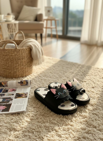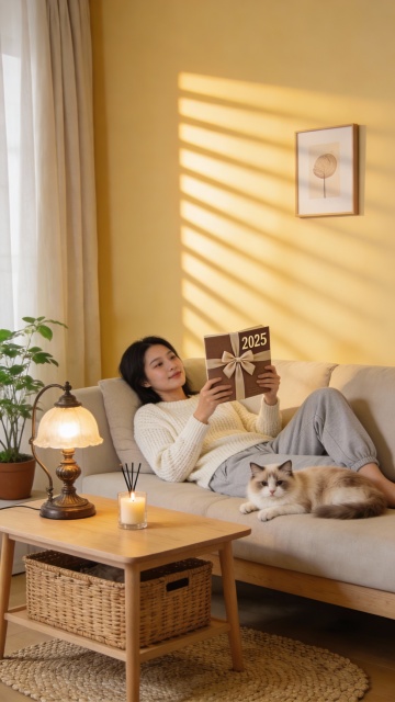 明亮通透的室内场景,柔和的自然光从法式玻璃门洒入,照亮整个空间,营造出宁静、舒适、温馨的氛围。前景中,一位穿着素雅连衣裙的女性侧身坐在藤编椅上,手持书本,姿态放松惬意,脚边散落着一双拖鞋,地面铺有浅色编织地毯。背景是两扇宽大的落地窗,悬挂着带有黑色书法文字图案的米白色亚麻质感窗帘,窗帘轻盈垂坠,随风微拂,书法字体飘逸洒脱,充满东方韵味。房间内陈设简约雅致,一旁的木质边桌上摆放着一盏造型古朴的台灯,光线柔和。窗外可见郁郁葱葱的绿色庭院,增添自然生机。整体画面采用写实风格,光影过渡自然,色彩以米白、浅灰、原木色为主调,温暖和谐,细节丰富,质感细腻,构图遵循三分法,视觉焦点集中在人物与窗帘的互动关系上,传递出悠闲自在的生活情调。