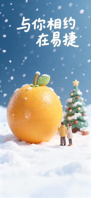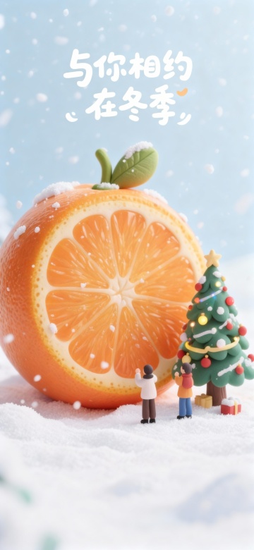 温暖灯光下,毛绒质感的橙子与雪景圣诞树相映,微缩艺术风搭配粘土风细节,营造出温馨、可爱、柔软的节日氛围。