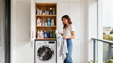 清新自然的窗台场景,柔和光线洒落,三款色彩明亮的清洁产品置于木质窗台,搭配绿植与海绵,呈现轻拟物风与实景感,传递清爽舒适的生活美学。