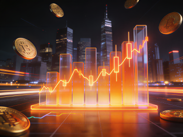 赛博朋克风3D图表,霓虹光影交织,金属比特币悬浮飞舞,未来感十足的虚拟现实金融场景。
