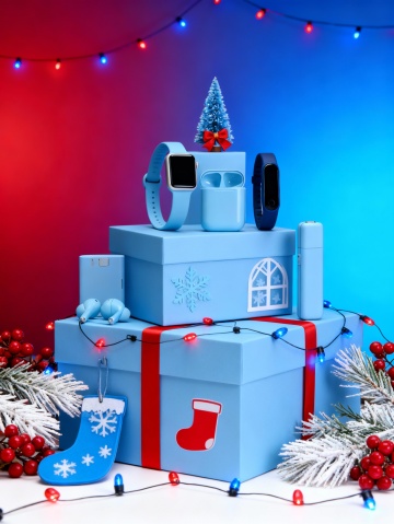 现代感与科技感交融的3D风设计,金属质感耳机置于蓝调礼盒中,重拟物风格凸显商务精致,搭配丝带营造节日氛围。