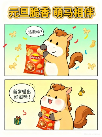 暖色调水彩漫画分镜:核心主体是一匹毛发光泽的浅棕色小马,小马呈仰头甩尾的活泼姿态,伴随气球飘飞,表情甜笑,举着一支烟花棒迸出粉色艺术字气泡 “元旦接福 快乐起步”,搭配漫画拟声词 “嘭!”“嘻!” 增添欢快感,背景是漫画分镜拼接的温馨客厅场景,底部露出摆着热饮的桌面漫画格子,含 “新岁皆安 2026” 字样、蝴蝶结符号