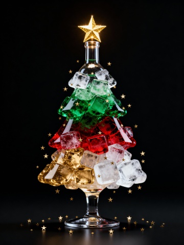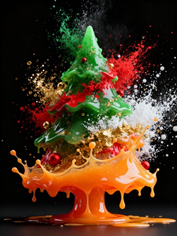 液态圣诞树,3D重拟物风格,融合粒子飞溅与梦幻色彩,喜庆酷炫,虚拟自然元素交织,节日氛围爆棚。