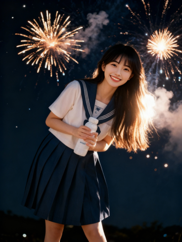 背景换为深色夜空里炸开的几朵烟花,有火光、烟雾、光斑,根据环境调整人物的边缘光,发丝光,逆光,衣服边缘发光,写实风格