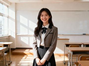 一位年轻亚洲女性的上半身特写,她有着自然的黑色长直发,前发整齐垂落于额头,发丝柔顺有光泽。她穿着一件浅米色的针织开衫,内搭白色衬衫,领口处系着一个小巧的黄色蝴蝶结。她的表情温柔自然,嘴角微微上扬,眼神清澈明亮,带着一丝腼腆的微笑。她的右手轻轻搭在胸前,姿态优雅大方。背景是一片明亮的室内环境,光线柔和,色调温暖,给人一种舒适惬意的感觉。整体画面风格清新自然,色彩明亮柔和,光影效果细腻,具有高度的写实感和细腻的质感表现。