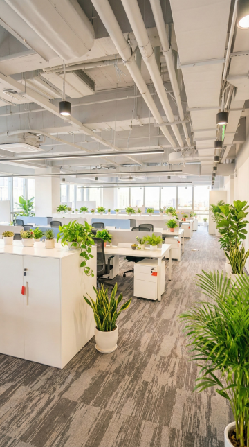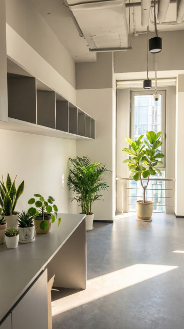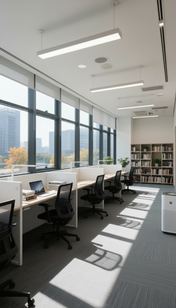 高写实3D渲染风格的现代办公室内部场景,采用明亮通透的采光设计,大面积落地窗引入自然光,窗外可见城市高楼与秋季树木景观。室内以浅灰色、白色和原木色为主色调,搭配深灰色地面,形成简洁专业的色彩和谐。天花板悬挂整齐排列的长方形LED平板灯,与自然光共同营造柔和均匀的光影效果,地面投射出清晰的窗格阴影。开放式办公布局,配备浅色实木办公桌、黑色办公椅、白色文件柜和黑色电脑显示器,书架上整齐摆放书籍和文件夹,窗台及办公桌角落点缀绿色植物增添生机。空间线条简洁流畅,展现出现代、简约、高效的办公氛围,可从不同角度(如靠窗视角、办公室中央视角、走廊视角等)展示,环境可替换为不同城市景观(如商业区、公园旁、海滨等)的办公室背景。