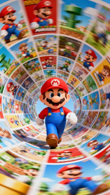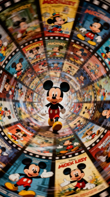 画面中有许多经典三丽鸥场面呈螺旋状排列,hello kitty在旋转的海报中行走。固定聚焦在他身上,周围呈现朦胧模糊、涂抹、拖影的效果。