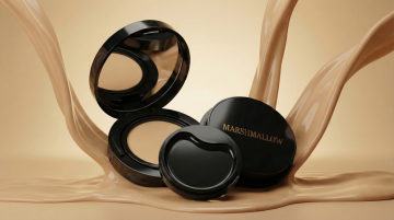 在纯白色背景上,以高清晰产品摄影风格展示六个不同的高端美妆产品,保持统一的精致感和专业光影效果:左侧第一列为打开的红色口红,金色金属外壳搭配黑色底座;右侧第一列为圆形腮红膏,带有金色装饰的黑色盖子,内部呈现自然的粉色腮红;左侧第二列为四色眼影盘,黑色外壳,打开后展示四个渐变大地色系眼影;右侧第二列为透明玻璃瓶身的金色液体高光,瓶盖为黑色带有金色品牌标识;左侧第三列为黑色方形眉粉盒,附带小眉刷;右侧第三列为带有金色边框的黑色唇膏,膏体为复古暗红色。所有产品排布整齐,间距均匀,光线从斜上方照射,在产品底部形成柔和阴影,整体呈现简洁、高端、统一的美妆系列产品展示效果。