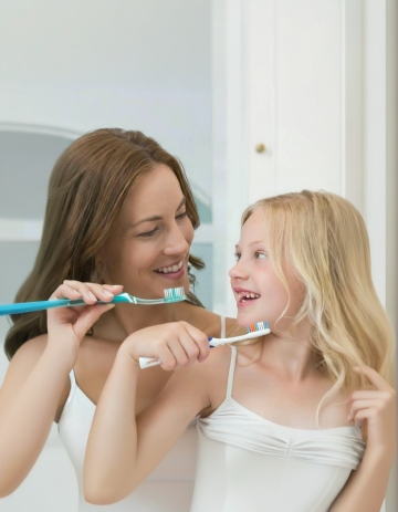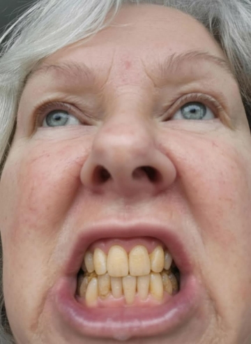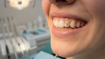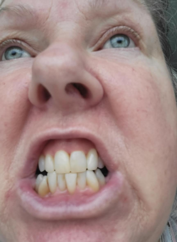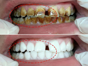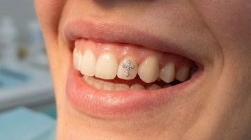 医疗场景融合方案:顾客半躺治疗椅,双手比耶露齿笑,十字架饰品与牙科器械形成专业与喜悦对比,浅蓝手术布为背景