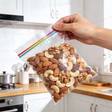 一只手拿着一个装着薯片的密封袋,厨房