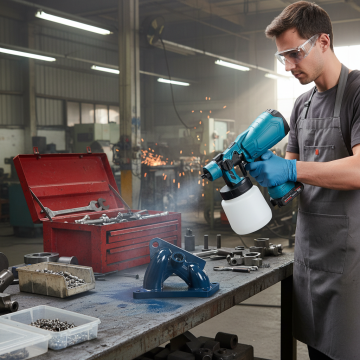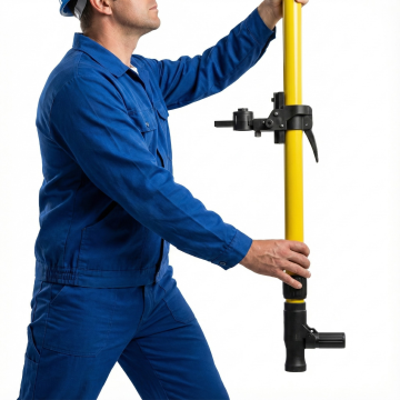 一个欧美工人正拿着图1这个机器正在给窗框打孔 只能打很薄的铝材或者钢材 打孔方式参考图2 图3 下端进气口连接一个气泵 有工业感景深效果 保持机器不要变形不要改变细节 生成四张