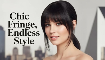 以图中的假发八字刘海为元素,欧美女人戴这个假发八字刘海,物体主体特征不变,设计6张跟假发八字刘海有关的图,可以加一些英语文案点缀,比例 「16:9」