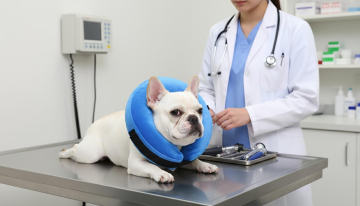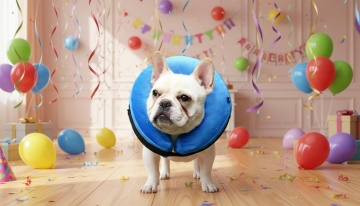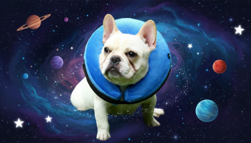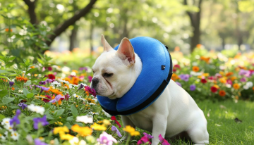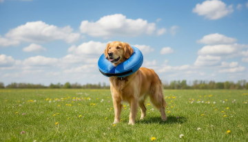以图中的狗狗伊丽莎白圈为元素,防舔脖套,物体主体特征不变,设计6张跟狗狗伊丽莎白圈有关的图,比例 「16:9」