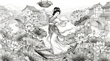 水墨风白描仕女泛舟采莲,古典中式庭院静谧优雅,工笔细腻勾勒荷塘月色,唯美感与文艺气息交融。