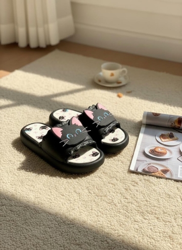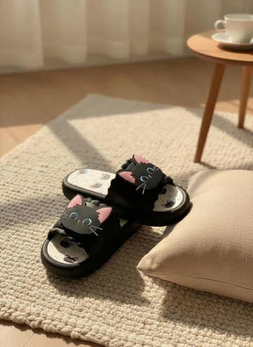 保持原图主体不变,更改背景,一双拖鞋放在地毯上,旁边有杂志或是一个枕头又或是一杯咖啡,营造出一种阳光休闲下午茶的快乐时光,比例是3:4,分别生成10张拖鞋摆放姿势不同的图片