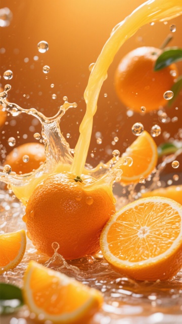 简约主义风格,橙汁与冰块碰撞,清新爽口,夏日清凉感十足。