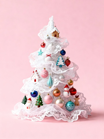 剪纸风与拼贴风结合的圣诞树,红绿金白层层叠叠,几何造型简约生动,金色星星点亮节日喜庆,温馨趣味跃然纸上。