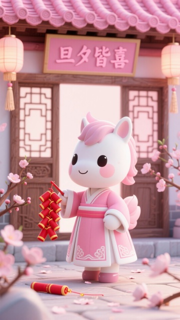 Q版白色小马身着粉色带黄色镶边的中式唐装,佩戴黑色墨镜,咧嘴大笑,双手抱着一个大号金色元宝,周围散落金色铜钱、写有 “福”“幸” 字的红包,背景是财神庙,画面上方有金色书法字体“马上有钱”,两侧悬挂鞭炮,整体粉金色调。