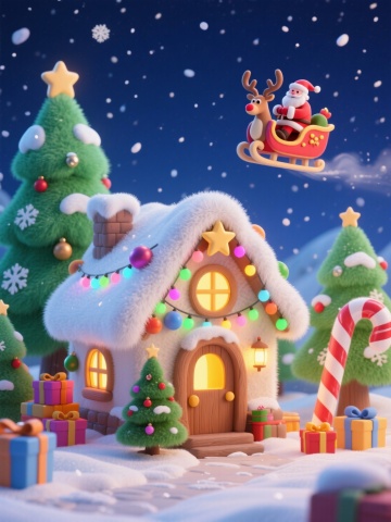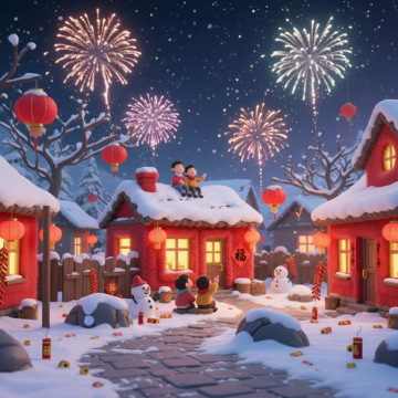 一个巨大毛绒绒饺子形状的卡通房子,房子内部是一家三口其乐融融的在吃着热气腾腾的饺子,房屋外面有棵盛开的黄色腊梅花,旁边有个围着红围巾的雪人,一个毛绒绒小松鼠和松树,天空中飘着雪花,整体细节丰富,色彩温馨,主题字“冬至”采用毛绒绒风格