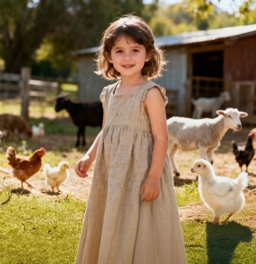 明亮的纯橙色背景,一个穿着白色镂空花纹衬衫和米色条纹背带裙的小女孩,脖子上系着一条绿色底印有白色雏菊和橙色小花图案的丝巾,她微微歪着头,睁大眼睛,嘴角上扬,露出开心的笑容,眼神中带着一丝俏皮和好奇,整体画面色彩明快,光线柔和,人物表情生动自然,具有清晰的肖像摄影风格。