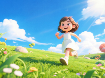 甜美卡通女孩,粉色裙装,软3D风格,清新花田背景,童趣盎然。