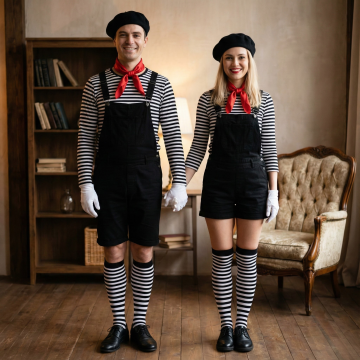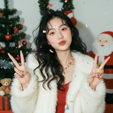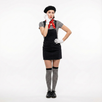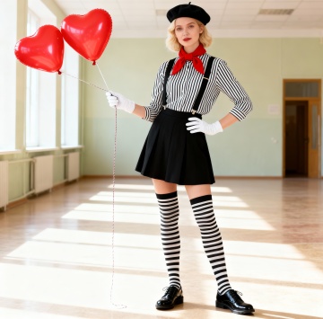图中是一套袖套+眼镜-发箍-耳饰+袜子的五件套服装装饰,请生成一张三个欧美白人女性都穿着图中的袖套+眼镜-发箍-耳饰+袜子的五件套服装装饰,除此之外衣服是不同风格的红色的连衣裙,三人站在室内派对的现场,正视,图片比例1:1