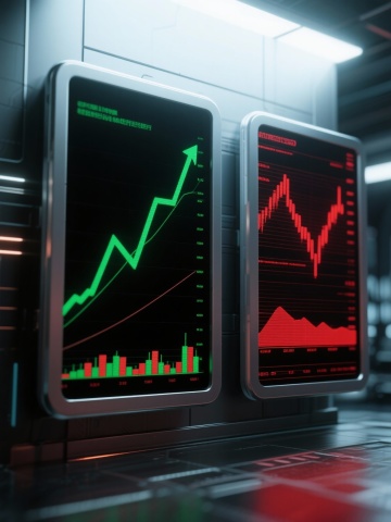赛博朋克风格的金融数据可视化场景,深蓝色与霓虹粉为主色调,光线呈现科技感十足的蓝色光源与粉色高光交织,具有强烈的光影对比和细腻的阴影细节,前景是由蓝色网格线和动态波动的红色柱状图表构成的数据界面,图表线条流畅且带有发光效果,背景为深邃的宇宙星空,点缀着闪烁的星辰和星云,营造出神秘而充满未来感的氛围,整体画面采用近景聚焦数据图表、远景虚化星空的景深控制,呈现出清晰的视觉层级,科技感十足的数字艺术风格,强调数据流动的动态美感与宇宙空间的广阔深邃,信息传达高效且符合科技与金融融合的主题。