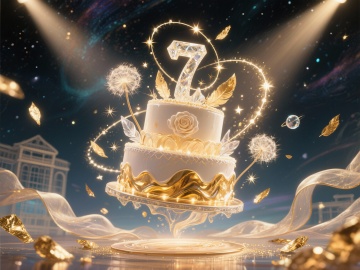 1. 色彩架构 ▸ 主色阶:雾霭香槟金 → 蔷薇星云粉 → 银河釉蓝的渐变交融 ▸ 高光色:月光珍珠白 | 幻彩极光(局部折射) ▸ 暗部:丝绒紫灰底色,带有微光星点 2. 中心艺术装置 七层悬浮蛋糕结构: → 底层:流动的液态金箔波纹 → 中层:半透明水晶糖霜材质,内嵌绽放的发光玫瑰 → 顶层:旋转的星轨圆环,托起巨大的钻石糖“7”字形雕塑 环绕元素: → 飘散的金色羽毛与发光蒲公英 → 动态光粒如萤火虫般螺旋上升 → 极细的铂金丝线牵引着微小星球 3. 背景梦境层 星空处理:柔焦光斑与细腻星云,采用印象派笔触 光影特效: → 两道交叉的柔光追光灯束穿透场景 → 多层次的光晕扩散(采用虹彩衍射效果) → 前景添加半透明薄纱质感滤镜层 4. 品牌融合区 酒店建筑轮廓以水晶线稿形式隐现于背景深处 缎带状光带绕行画面,承载定制文字信息 ✨ 特色梦幻细节 动态感设计:所有悬浮元素均有上扬趋势,营造轻盈梦境 材质碰撞: → 坚硬的晶体与柔软的羽毛 → 流动的金液与凝固的糖霜 光影魔术:采用“丁达尔效应”光线,可视化的光之路径 📱 多场景适配方案 庆典主视觉:保留完整细节,中心蛋糕塔突出 社交海报:强化顶部星云与底部信息区对比 邀请函封面:聚焦蛋糕中上部的精致结构 周边衍生:可提取羽毛、星轨等元素作为图案基底 🎭 情绪传达 比“庆祝”更轻盈,比“华丽”更飘渺 在现实与梦境的边界,赴一场七年一瞬的鎏金之约