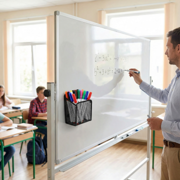 在卧室桌面上有着书架桌面置物架洞洞板收纳架学生铁艺整理架子在侧面吸着,磁吸收纳盒里放着一些可擦笔
