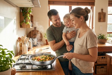一个明亮整洁的现代厨房,采用简约优雅的设计风格,以白色为主色调,搭配黄铜色金属装饰细节。厨房整体呈现出温馨舒适的氛围,阳光透过百叶窗洒入,在白色橱柜和大理石台面上形成柔和的光影效果。白色的橱柜带有黄铜色的圆形拉手,上方的吊柜和下方的地柜组合提供了充足的储物空间。大理石台面光滑洁净,带有自然的灰色纹理。台面上有一个双槽不锈钢水槽,搭配黄铜色的水龙头。水槽旁边的金属桶里插着木质的锅铲和汤勺。墙面安装着黄铜色的挂杆,上面挂着各种木质和金属材质的厨房用具,包括勺子、铲子等。挂杆上方的白色搁板上摆放着不锈钢和玻璃材质的储物罐,里面装着各种香料和食材。台面上还摆放着一个白色的盘子,里面放着几块叠在一起的三明治,旁边还有一盘色彩鲜艳的沙拉。整体构图采用了三分法,光线从左侧窗户进入,营造出明亮通透的感觉,细节丰富,质感细腻,展现出干净利落的现代厨房设计感。