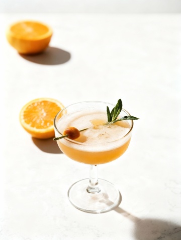 清透玻璃杯盛装金黄鸡尾酒,搭配迷迭香与金桔,光影柔和,水彩般清新雅致,尽显夏日文艺氛围。