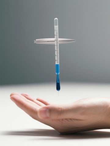 极简构图,高清晰度实验室背景特写,在磨砂玻璃台面上,三支等高的透明玻璃试管呈正三角形排列,每支试管中精确盛有三分之二体积的冰蓝色液体,液体表面漂浮着三枚完美对称的气泡,右侧戴着无粉蓝色丁腈手套的拇指与食指正捏持一支细长的移液管,尖端悬停在中央试管正上方2毫米处,一滴晶莹的透明液滴即将脱离吸管,背景为均质的浅灰色环氧树脂墙面,顶部嵌入式LED灯带形成柔和的漫反射光源,在试管壁上投射出平行的光带,整体色调由冰蓝、雾白与浅灰构成,无任何多余元素,画面呈现出数学般的精确对称感,传达出冷静、纯粹的科学美学。