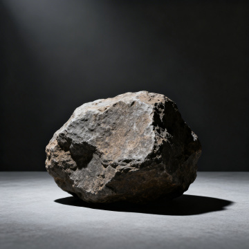 极简主义风格静物摄影,黑色背景,左上角一束柔和的聚光灯倾斜照射,照亮前景的黑色细沙地面,沙粒质感细腻且带有反光,左侧一块较大的深色岩石带有粗糙表面和少许橙色纹理,右侧一块较小的灰色岩石,整体画面营造出神秘、沉静、富有质感的氛围,光线过渡自然,阴影柔和,主体突出,构图简洁平衡。