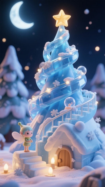 梦幻感十足的3D微缩艺术风圣诞场景,玻璃质感的螺旋树与软3D小精灵共筑温馨冬夜,点缀星光与暖灯,尽显可爱与童话氛围。
