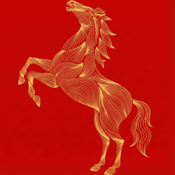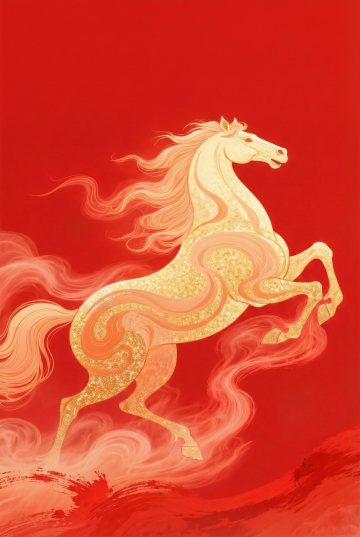 金色主色调背景,具有细腻的磨砂纹理与柔和的渐变光泽,右下角点缀闪烁的金色颗粒质感,整体呈现温暖而华丽的金属光泽感,融入中国风元素与万马奔腾的壮阔场景,马匹姿态昂扬、鬃毛飞扬,以流畅的线条勾勒出动态奔腾之势,背景可适当加入祥云纹、回纹等传统中国风装饰图案,保持整体金色调的和谐统一,营造出既具现代质感又不失古典韵味的磅礴氛围。