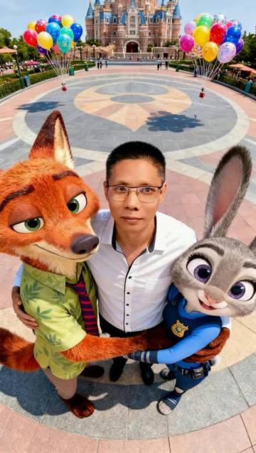 卡通感十足的3D角色风设计,融合动漫风格与真人元素,游乐园背景增添节日欢乐氛围,生动呈现跨次元互动场景。