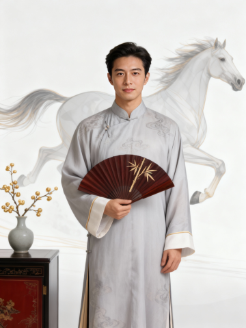 人物姿势自然优雅放松,表情柔和、温柔微笑;画面主体为身着浅粉色中式旗袍的(旗袍带细腻暗纹,领口缀珍珠扣),手持缀米色流苏的装饰性团扇,呈自然舒展站立姿态;背景为浅粉色渐变底色,搭配红金线条勾勒的全身半透明抽象骏马(完整马尾、马头、马蹄);右侧设中式木几,几上摆粉色花瓶,瓶插红色果实类花材;柔和国风美学,主色调浅粉 + 红 + 金,平视中景构图,女性占画面核心,静态展示。