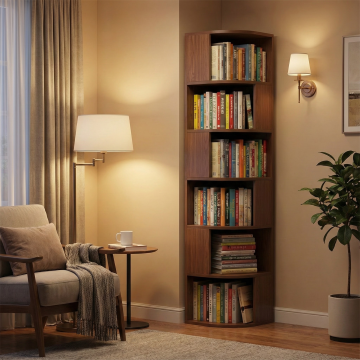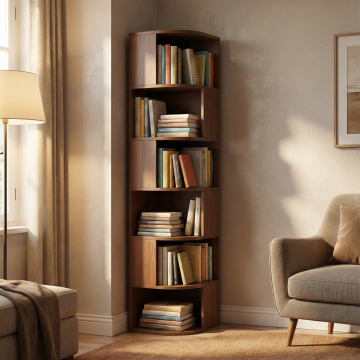 主体是5 个堆叠在一起的深胡桃木色方凳:凳面为正方形(边长约 35cm),表面是哑光深棕胡桃木纹理(带有自然木结细节),边缘做轻微圆角处理;凳腿是 4 根圆柱形实木(直径约 5cm,略带自然弯曲弧度),整体设计简约圆润。5 个方凳以错落堆叠的方式摆放(最上方凳面水平,下方凳体轻微错开,露出部分凳面和凳腿,呈现自然的收纳状态)。